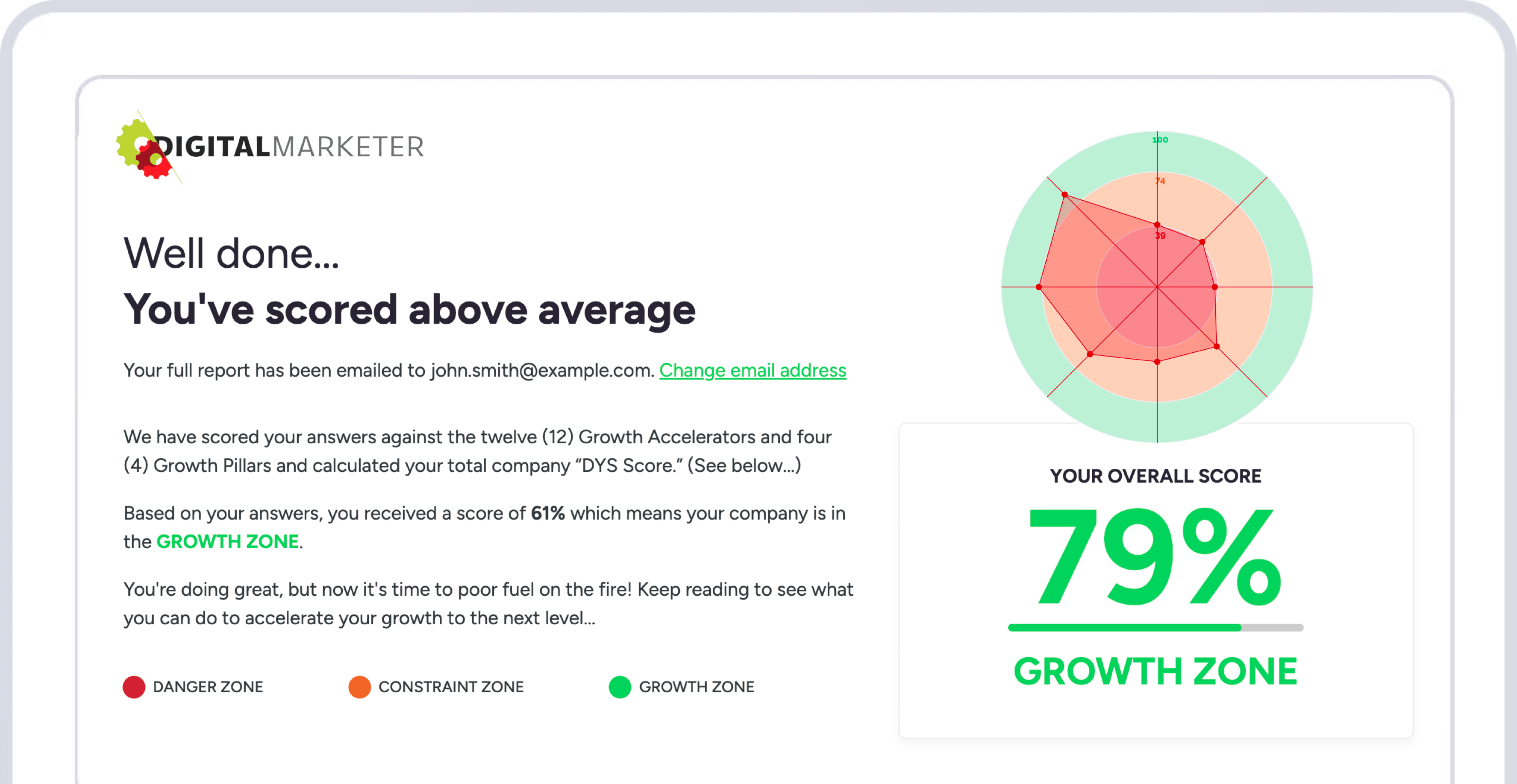 Once completed, you'll get an overall "$100k Months Score," as well as a score for each of the 4 Growth Pillars so you know where you're strong and where you can optimize.